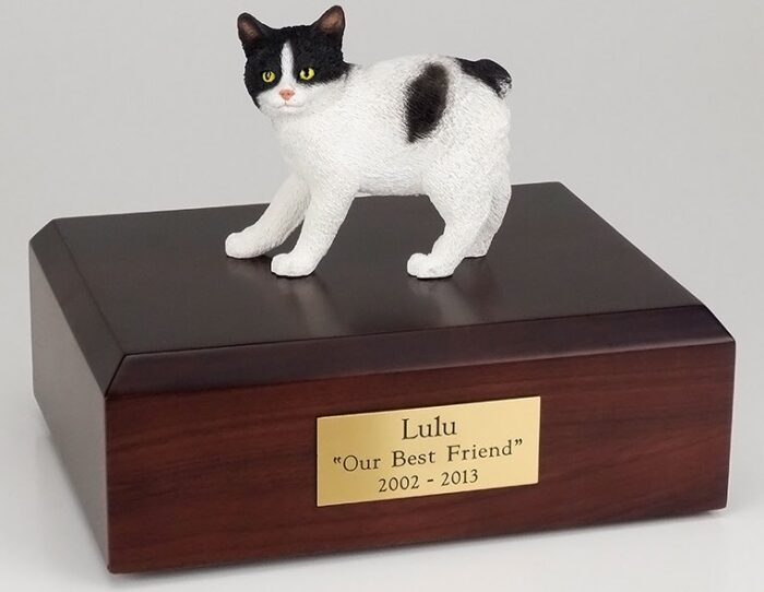 Our most popular urn is our Figurine Urn, made from solid hardwood. (Available in maple, oak, or walnut stain). This urn offers you a choice of over 700 different purebred dog and cat figurines attached to our beautiful wood urn bases. For an additional fee, this Manx Cat cremation urn also includes your personal (4 line 100 character) inscription on a premium leaded brass nameplate. Pet’s bagged ashes are installed through removable bottom which is secured with screws, providing tamper resistant protection. See chart below for enclosure capacity.