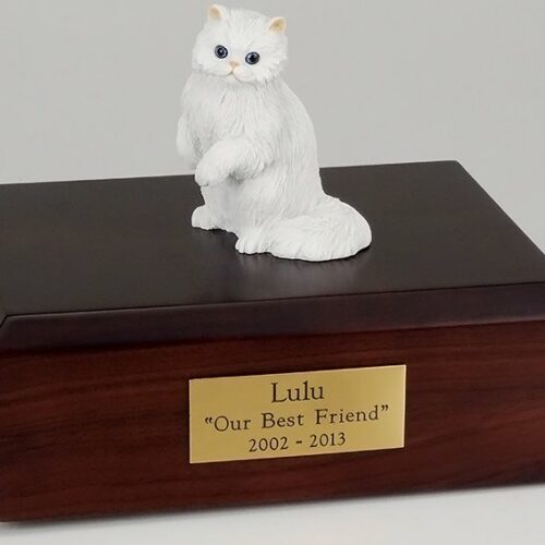 Our most popular urn is our Figurine Urn, made from solid hardwood. (Available in maple, oak, or walnut stain). This urn offers you a choice of over 700 different purebred dog and cat figurines attached to our beautiful wood urn bases. For an additional fee, this Laying Persian Cat cremation urn also includes your personal (4 line 100 character) inscription on a premium leaded brass nameplate. Pet’s bagged ashes are installed through removable bottom which is secured with screws, providing tamper resistant protection. See chart below for enclosure capacity.