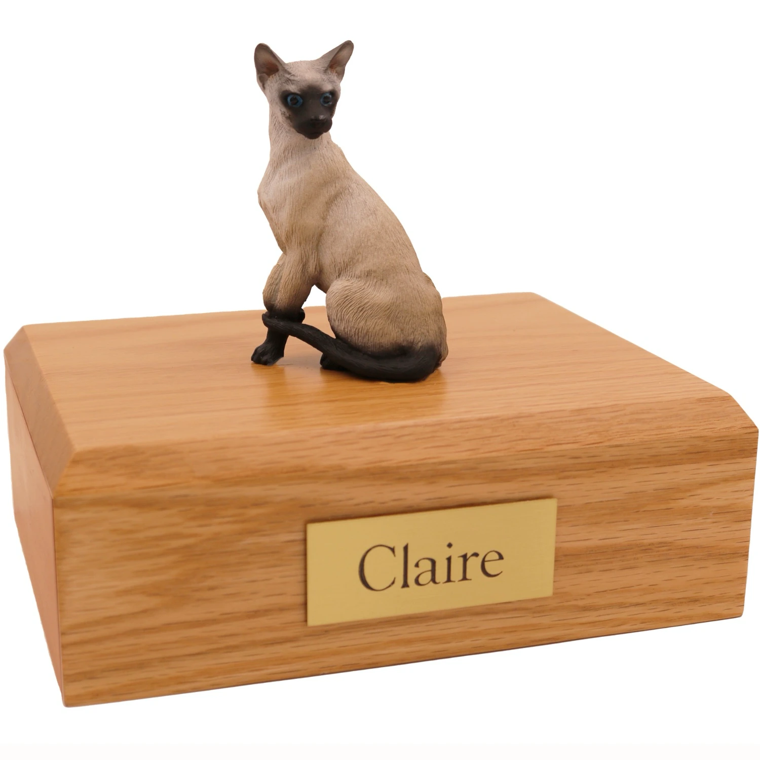 Our most popular urn is our Figurine Urn, made from solid hardwood. (Available in maple, oak, or walnut stain). This urn offers you a choice of over 700 different purebred dog and cat figurines attached to our beautiful wood urn bases. For an additional fee, this Siamese Cat cremation urn also includes your personal (4 line 100 character) inscription on a premium leaded brass nameplate. Pet’s bagged ashes are installed through removable bottom which is secured with screws, providing tamper resistant protection. See chart below for enclosure capacity.