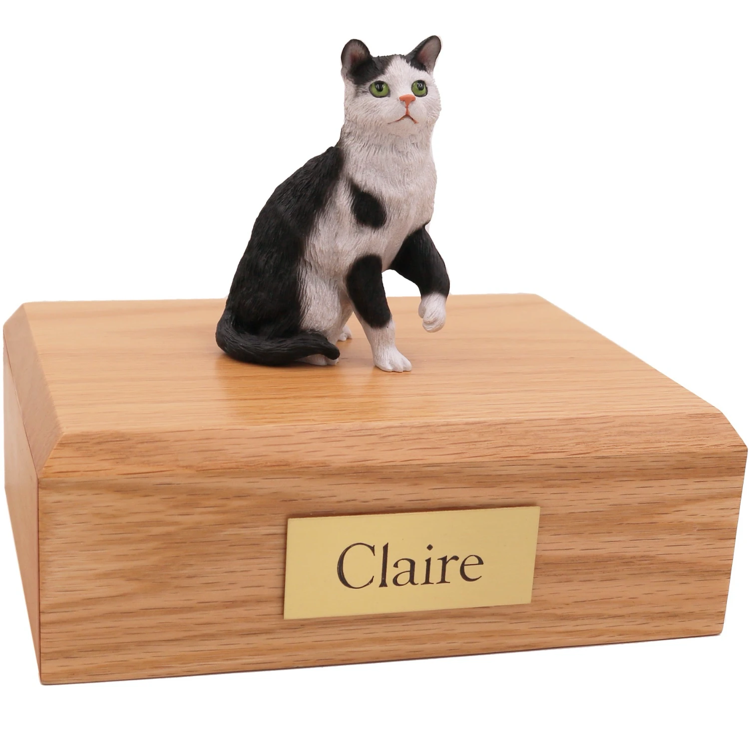 Our most popular urn is our Figurine Urn, made from solid hardwood. (Available in maple, oak, or walnut stain). This urn offers you a choice of over 700 different purebred dog and cat figurines attached to our beautiful wood urn bases. For an additional fee, this Tabby Cat (tuxedo) cremation urn also includes your personal (4 line 100 character) inscription on a premium leaded brass nameplate. Pet’s bagged ashes are installed through removable bottom which is secured with screws, providing tamper resistant protection. See chart below for enclosure capacity.