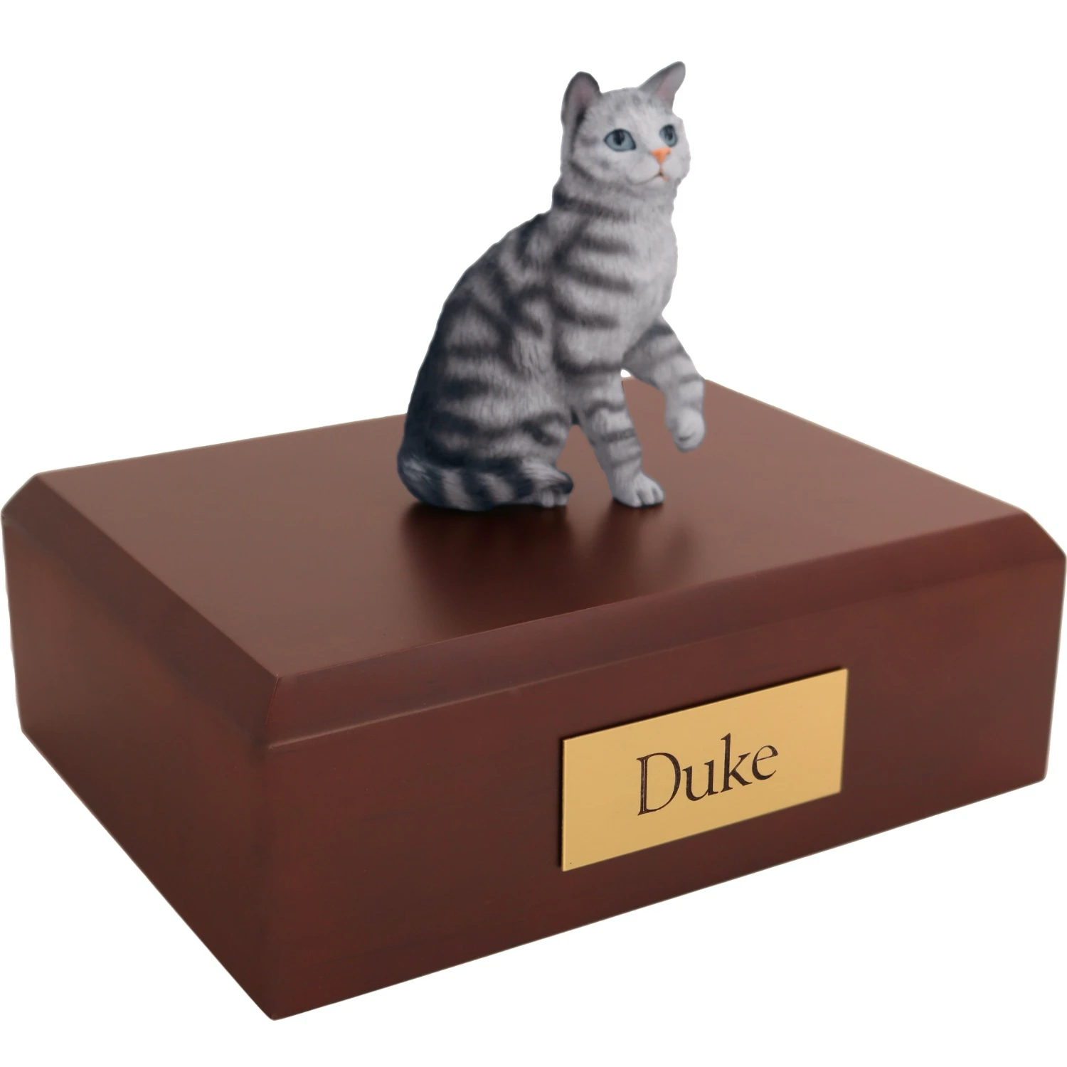 Our most popular urn is our Figurine Urn, made from solid hardwood. (Available in maple, oak, or walnut stain). This urn offers you a choice of over 700 different purebred dog and cat figurines attached to our beautiful wood urn bases. For an additional fee, this Tabby Cat cremation urn also includes your personal (4 line 100 character) inscription on a premium leaded brass nameplate. Pet’s bagged ashes are installed through removable bottom which is secured with screws, providing tamper resistant protection. See chart below for enclosure capacity.
