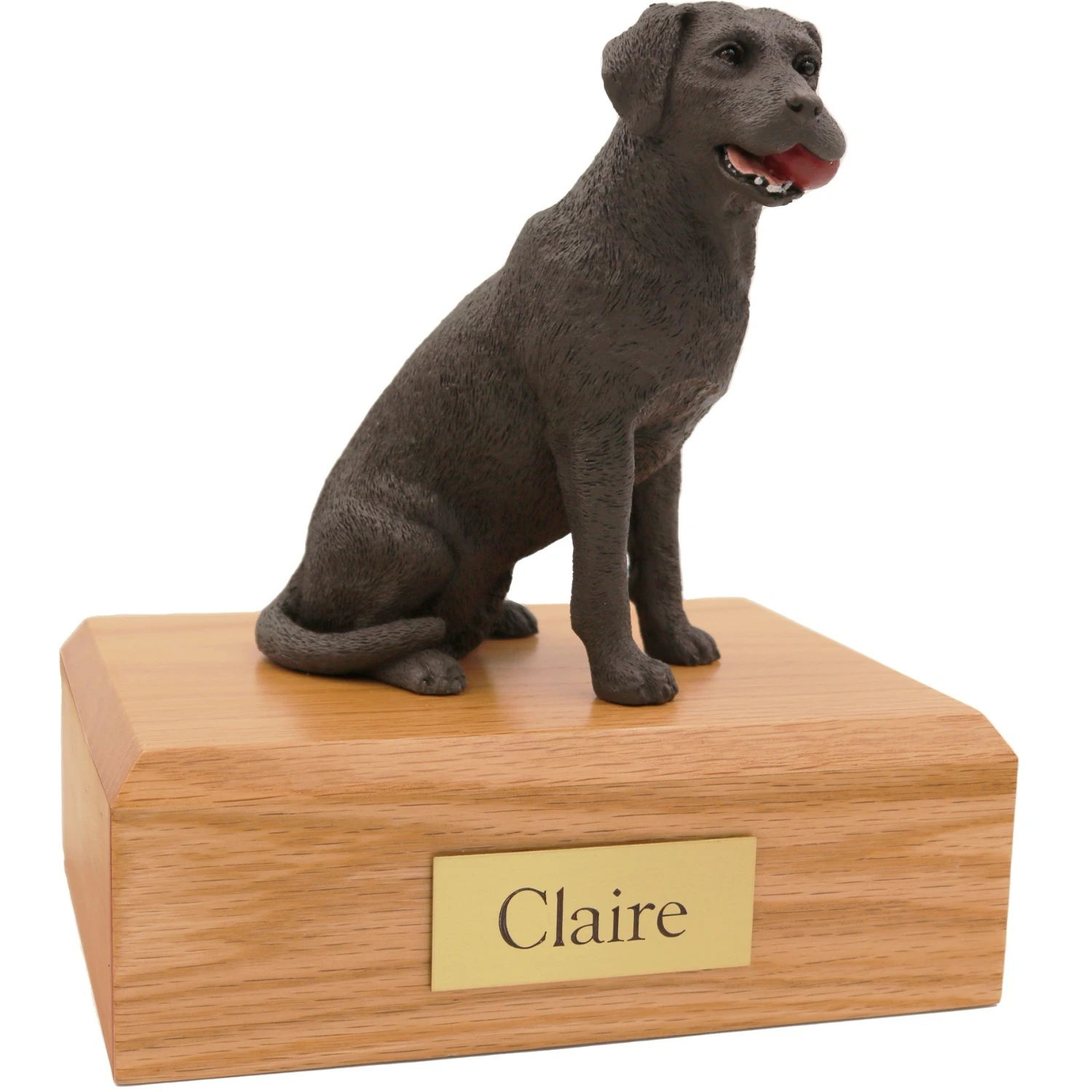 These Figurine Urns are the most requested urns we offer. They feature a meticulously crafted pet figurine atop an urn which has been made from solid hardwood. (Available in maple, oak, or walnut stain). This urn offers you a choice of over 700 different purebred dog and cat figurines attached to our beautiful wood urn bases. For an additional fee, this Chocolate Labrador cremation urn also includes your personal (4 line 100 character) inscription on a premium leaded brass nameplate. Pet’s bagged ashes are installed through removable bottom which is secured with screws, providing tamper resistant protection.