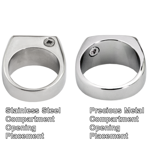 This handsome men’s style urn ring is available with or without an internal compartment. Compartment is easily filled through the secure opening by your funeral home or by you using the included small paper funnel. The cremation ring can be permanently sealed using superglue (not included).