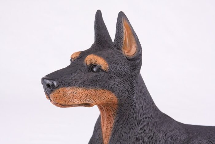 80 different styles of dogs, cats and rabbits are available in this exciting line of hollow figurine pet cremation urns suitable for indoor or outdoor memorial use. This ears up, black Doberman Pinscher figurine urn features a bottom access plug (2.5″ diameter) for secure installation of your beloved pet’s ashes. Some customers choose to modify their dog or cat’s collar and name tag for installation around the neck of their urn, while others choose to add an optional engraved plaque (see below).(Dimensions of figurine urn are 21.5″L x 7.5″W x 12.0″H)