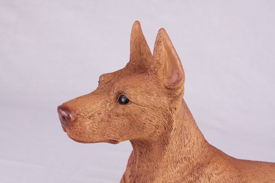 80 different styles of dogs, cats and rabbits are available in this exciting line of hollow figurine pet cremation urns suitable for indoor or outdoor memorial use. This ears up, red Doberman Pinscher figurine urn features a bottom access plug (2.5″ diameter) for secure installation of your beloved pet’s ashes. Some customers choose to modify their dog or cat’s collar and name tag for installation around the neck of their urn, while others choose to add an optional engraved plaque (see below).(Dimensions of figurine urn are 21.5″L x 7.5″W x 12.0″H)