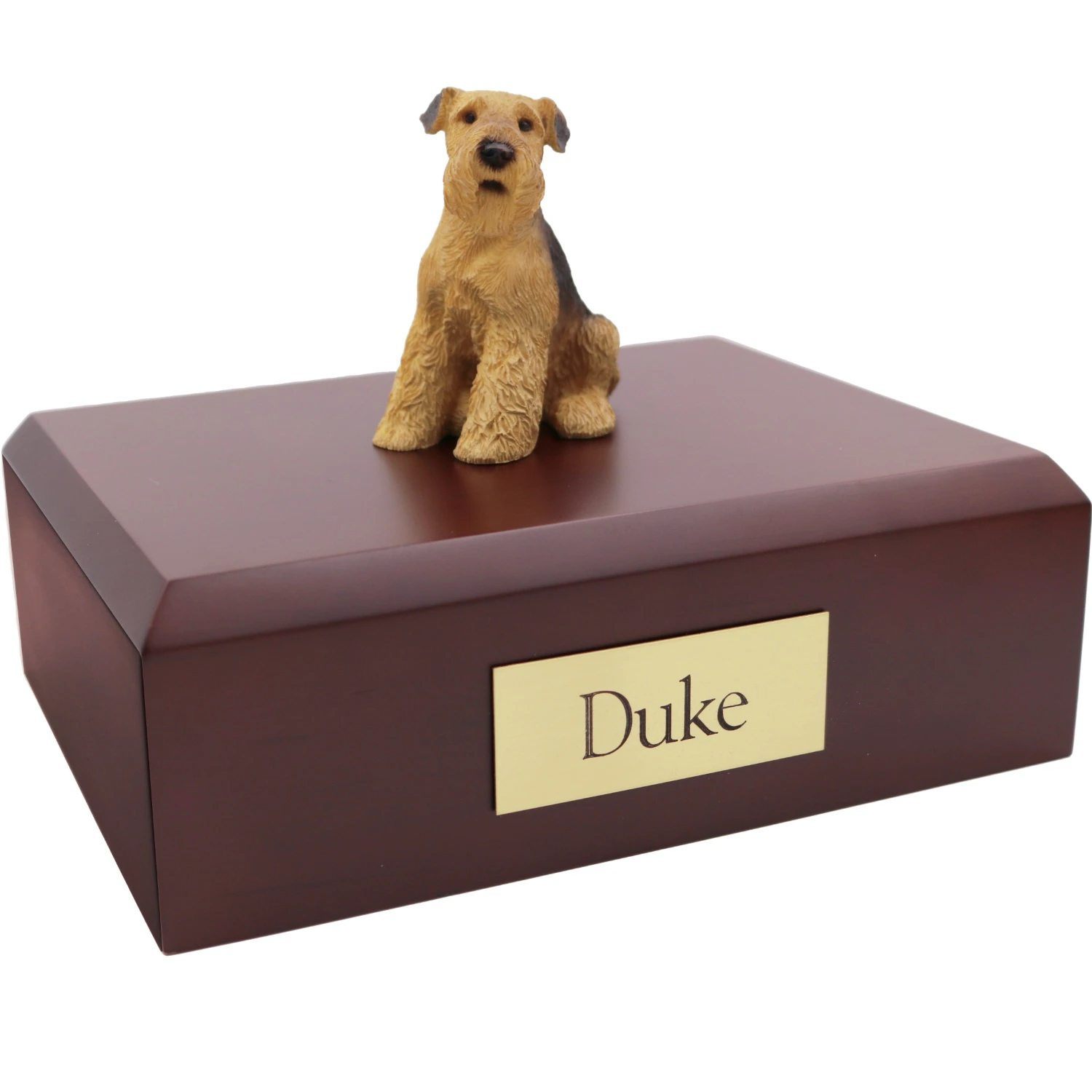 Our most popular urn is our Figurine Urn, made from solid hardwood. (Available in maple, oak, or walnut stain). This urn offers you a choice of over 700 different purebred dog and cat figurines attached to our beautiful wood urn bases. For an additional fee, this Airedale Terrier urn also includes your personal (4 line 100 character) inscription on a premium leaded brass nameplate. Pet’s bagged ashes are installed through removable bottom which is secured with screws, providing tamper resistant protection.