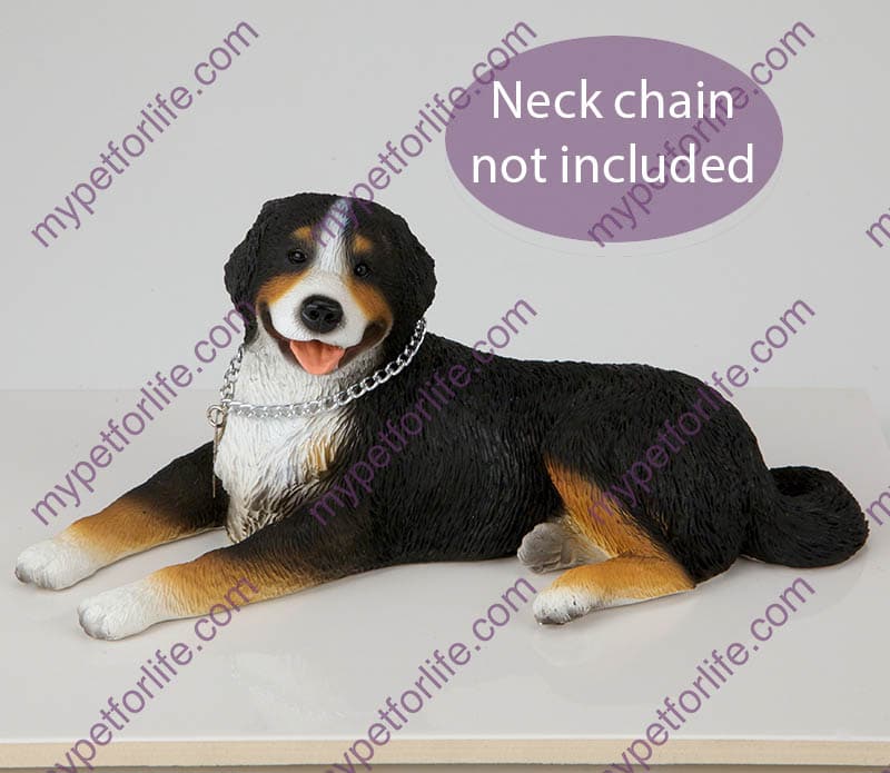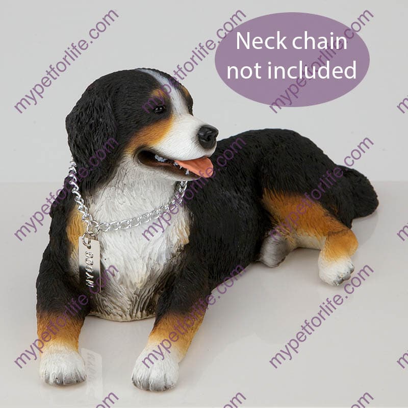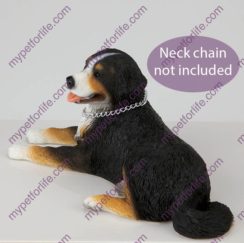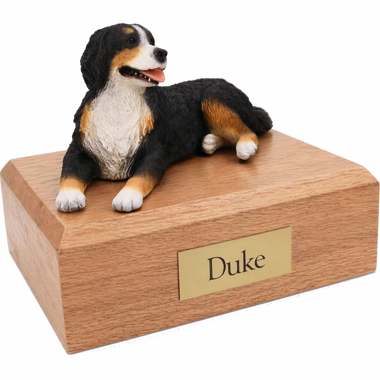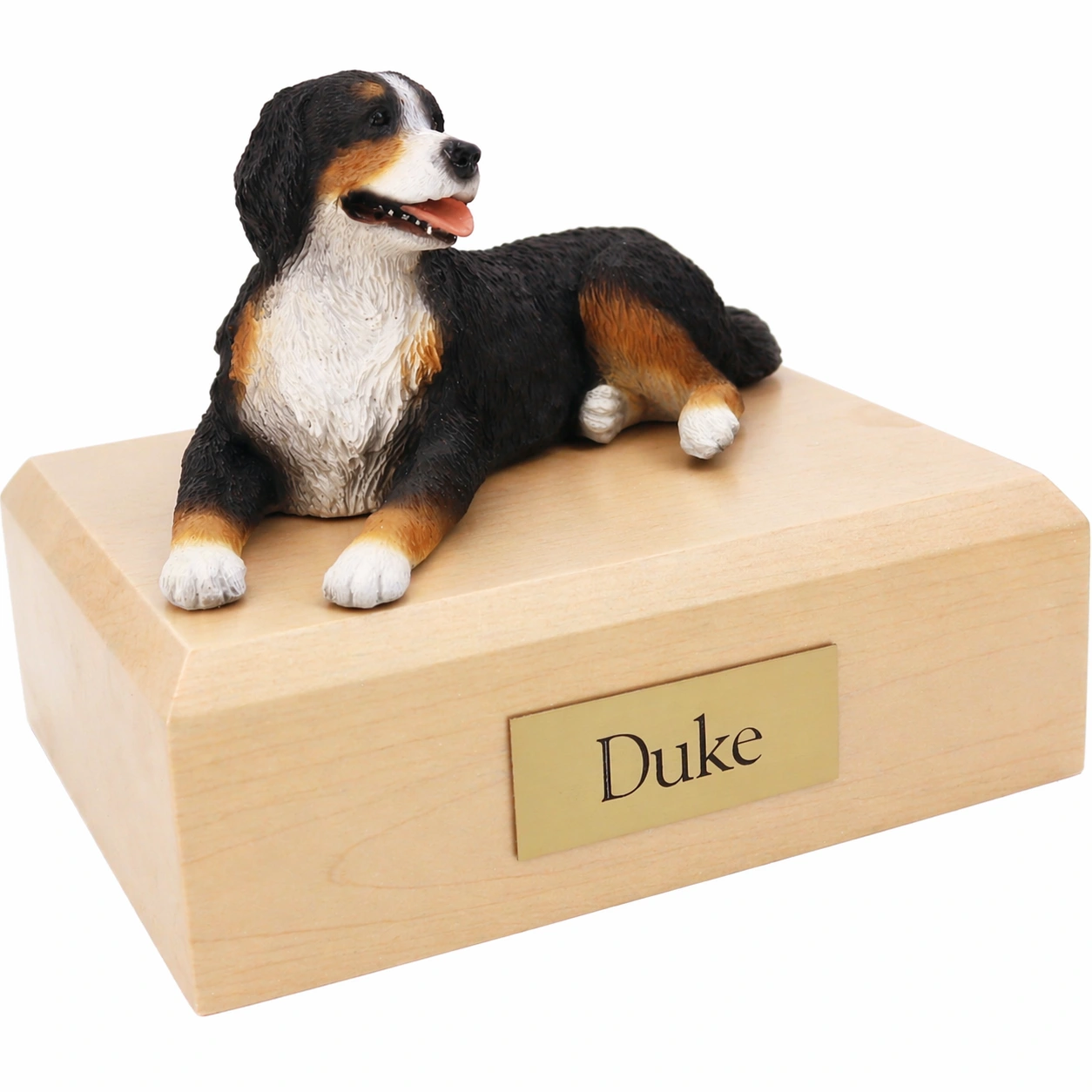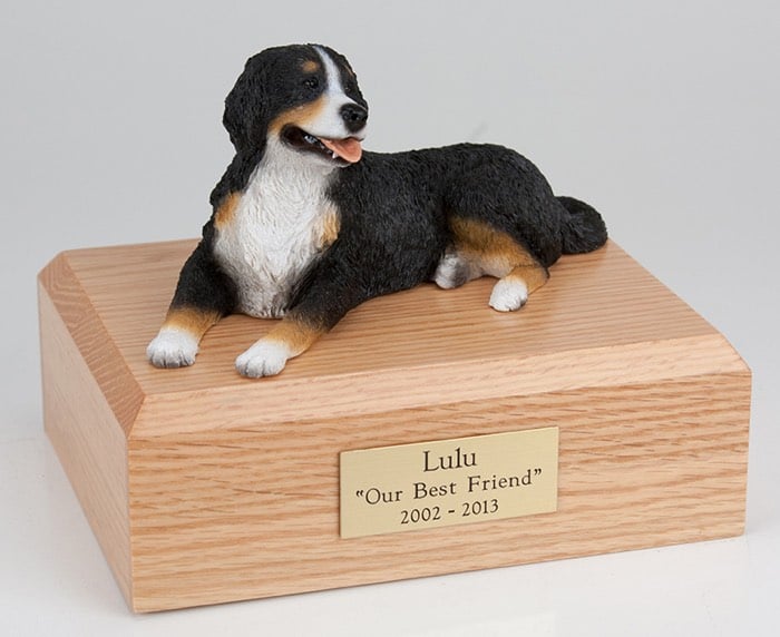 Our most popular urn is our Figurine Urn, made from solid hardwood. (Available in maple, oak, or walnut stain). This urn offers you a choice of over 700 different purebred dog and cat figurines attached to our beautiful wood urn bases. For an additional fee, this Bernese Mountain Dog urn also includes your personal (4 line 100 character) inscription on a premium leaded brass nameplate. Pet’s bagged ashes are installed through removable bottom which is secured with screws, providing tamper resistant protection.