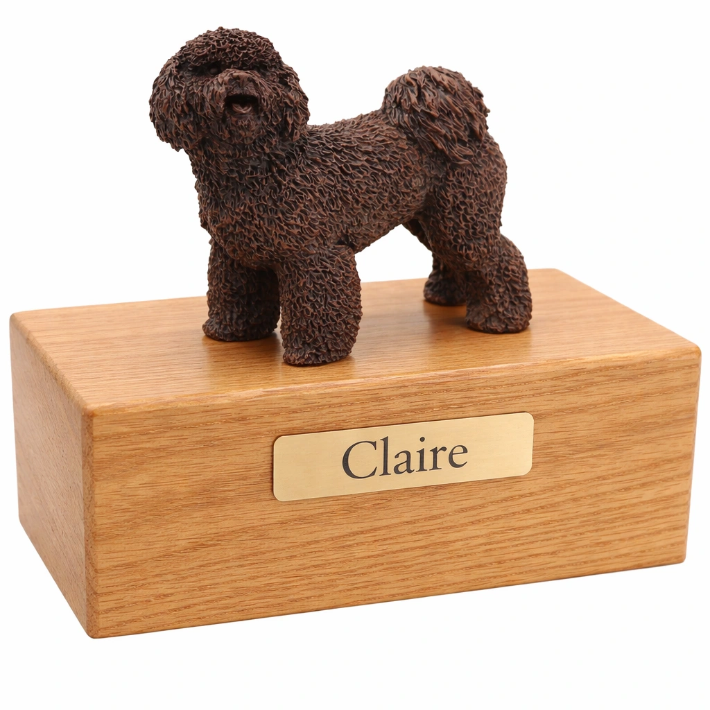 These wonderful “cold cast bronze” figurine urns are designed to look and feel like real bronze. Each figurine is hand painted in Italy and designed to appeal to pet owners whose pet didn’t have the exact coat or color patterns shown in our standard line of “color” figurines. Of course, some people simply prefer the classic appearance of these faux bronze figurines. Each urn base is made from medium density fiberboard (mdf) with a simulated dark walnut stain finish applied. This is a lower cost alternative to our solid hardwood urns, with an additional benefit being that the finish tends to be very consistent from one production series to the next. This means that an urn you purchase in the future will be a close match in color and grain to the ones available now. We’ve also added a genuine oak wood option.