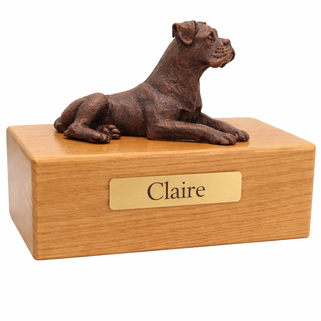 For an additional fee, this Boxer, Ears Down Dog urn also includes your personal (4 line 100 character) inscription on a premium leaded brass nameplate. Pet’s bagged ashes are installed through removable bottom which is secured with screws, providing tamper resistant protection.