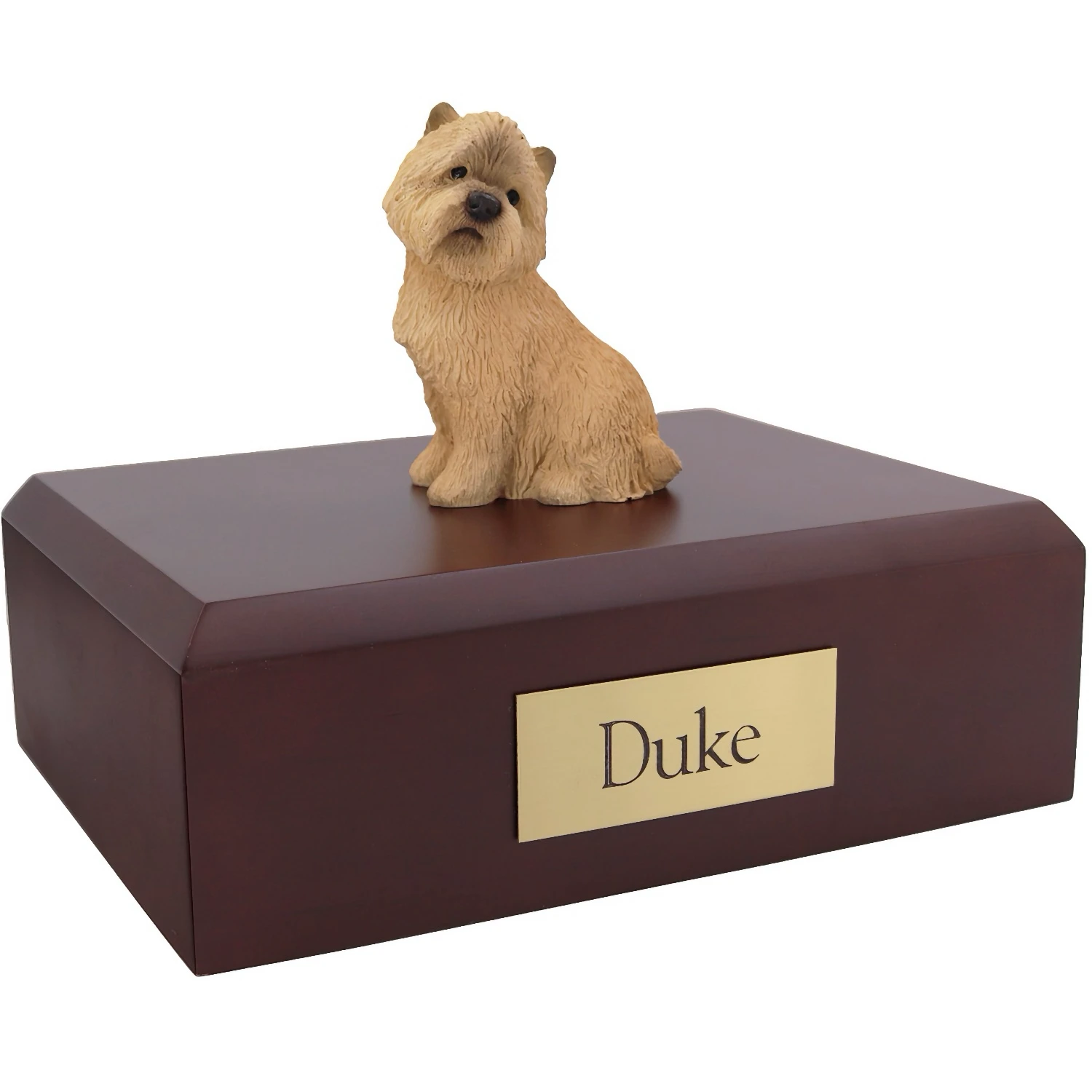 Our most popular urn is our Figurine Urn, made from solid hardwood. (Available in maple, oak, or walnut stain). This urn offers you a choice of over 700 different purebred dog and cat figurines attached to our beautiful wood urn bases. For an additional fee, this Cairn Terrier urn also includes your personal (4 line 100 character) inscription on a premium leaded brass nameplate. Pet’s bagged ashes are installed through removable bottom which is secured with screws, providing tamper resistant protection.