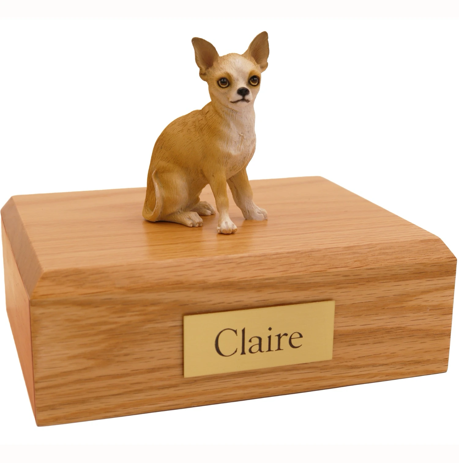 Our most popular urn is our Figurine Urn, made from solid hardwood. (Available in maple, oak, or walnut stain). This urn offers you a choice of over 700 different purebred dog and cat figurines attached to our beautiful wood urn bases. For an additional fee, this Chihuahua urn also includes your personal (4 line 100 character) inscription on a premium leaded brass nameplate. Pet’s bagged ashes are installed through removable bottom which is secured with screws, providing tamper resistant protection.
