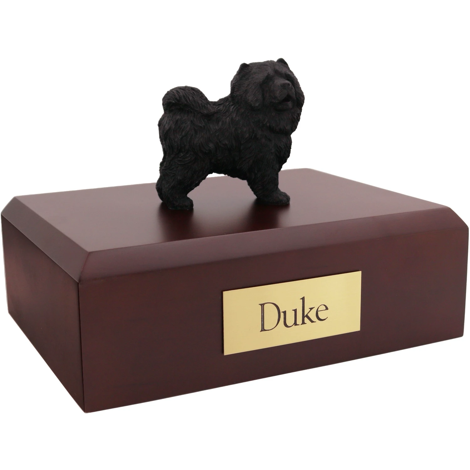 Our most popular urn is our Figurine Urn, made from solid hardwood. (Available in maple, oak, or walnut stain). This urn offers you a choice of over 700 different purebred dog and cat figurines attached to our beautiful wood urn bases. For an additional fee, this Chow Chow cremation urn also includes your personal (4 line 100 character) inscription on a premium leaded brass nameplate. Pet’s bagged ashes are installed through removable bottom which is secured with screws, providing tamper resistant protection.
