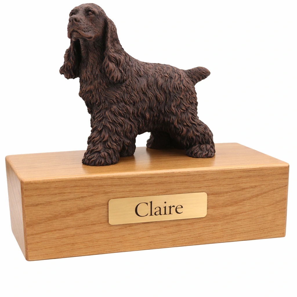 For an additional fee, this Cocker Spaniel dog urn also includes your personal (4 line 100 character) inscription on a premium leaded brass nameplate. Pet’s bagged ashes are installed through removable bottom which is secured with screws, providing tamper resistant protection.