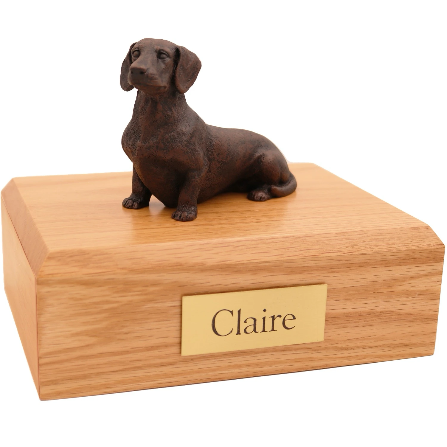 For an additional fee, this Dachshund cremation urn also includes your personal (4 line 100 character) inscription on a premium leaded brass nameplate. Pet’s bagged ashes are installed through removable bottom which is secured with screws, providing tamper resistant protection.