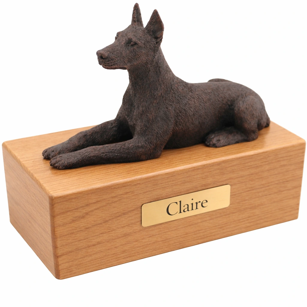For an additional fee, this Doberman Pinscher (aka “pincher”) dog urn also includes your personal (4 line 100 character) inscription on a premium leaded brass nameplate. Pet’s bagged ashes are installed through removable bottom which is secured with screws, providing tamper resistant protection.