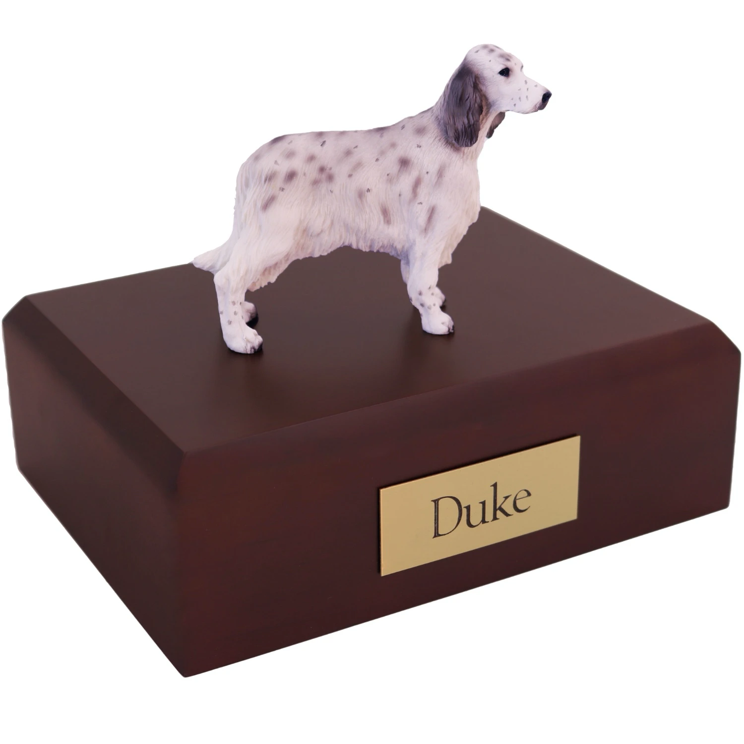 Our most popular urn is our Figurine Urn, made from solid hardwood. (Available in maple, oak, or walnut stain). This urn offers you a choice of over 700 different purebred dog and cat figurines attached to our beautiful wood urn bases. For an additional fee, this English Setter cremation urn also includes your personal (4 line 100 character) inscription on a premium leaded brass nameplate. Pet’s bagged ashes are installed through removable bottom which is secured with screws, providing tamper resistant protection.