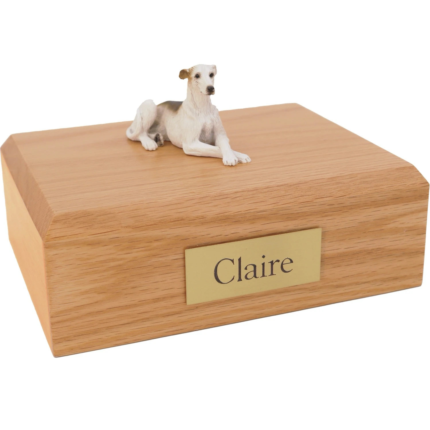 Our most popular urn is our Figurine Urn, made from solid hardwood. (Available in maple, oak, or walnut stain). This urn offers you a choice of over 700 different purebred dog and cat figurines attached to our beautiful wood urn bases. For an additional fee, this Greyhound cremation urn also includes your personal (4 line 100 character) inscription on a premium leaded brass nameplate. Pet’s bagged ashes are installed through removable bottom which is secured with screws, providing tamper resistant protection.