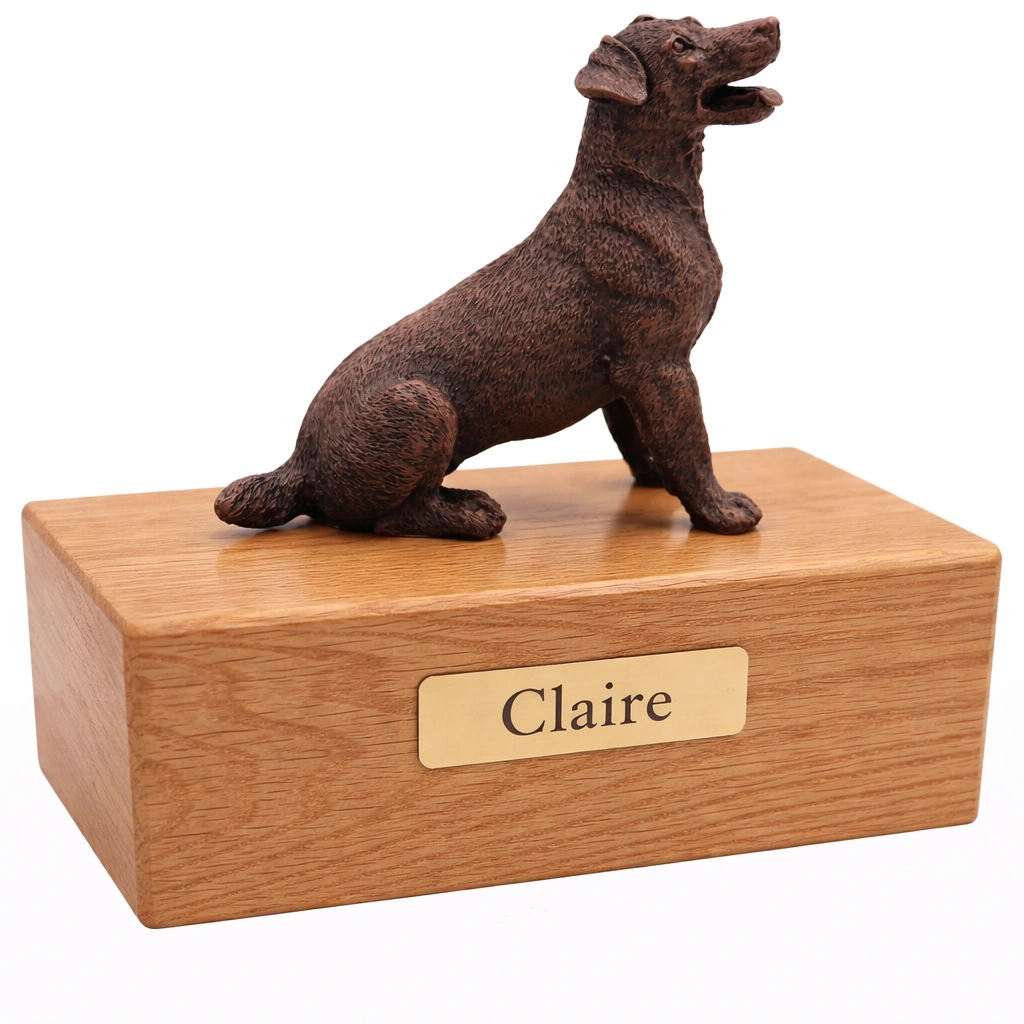 These wonderful “cold cast bronze” figurine urns are designed to look and feel like real bronze. Each figurine is hand painted in Italy and designed to appeal to pet owners whose pet didn’t have the exact coat or color patterns shown in our standard line of “color” figurines. Of course, some people simply prefer the classic appearance of these faux bronze figurines. Each urn base is made from medium density fiberboard (mdf) with a simulated dark walnut stain finish applied. This is a lower cost alternative to our solid hardwood urns, with an additional benefit being that the finish tends to be very consistent from one production series to the next. This means that an urn you purchase in the future will be a close match in color and grain to the ones available now. We’ve also added a genuine oak wood option.