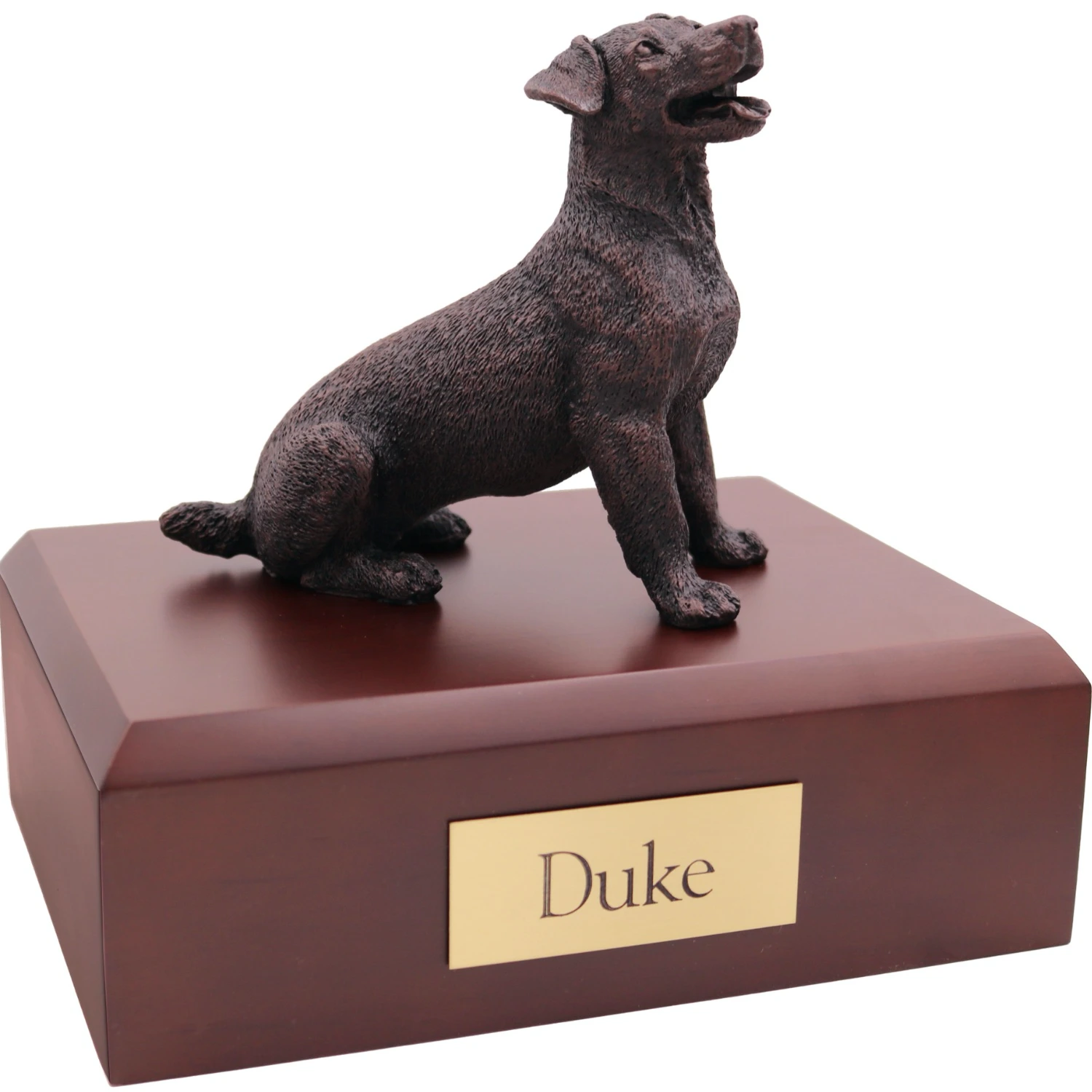Our “bronze-look” urns are a very popular alternative for customers who either can’t quite find a perfect match for their pet or who are more interested in the classic bronze look. These faux bronze figurines look and feel similar to bronze but are made from a special resin for durability and lasting beauty. The pet figurines have been painted by hand by Italian craftsmen and are mounted on your choice of our solid, sustainable hardwood bases, which are available in a light maple, medium oak or dark walnut finish.