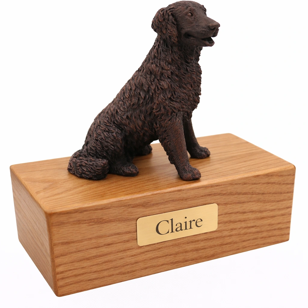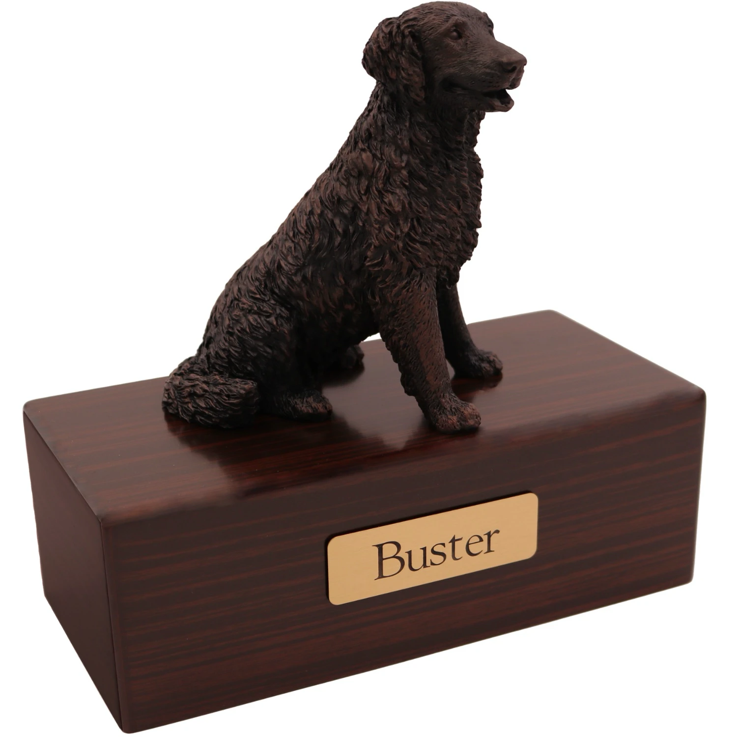 These wonderful “cold cast bronze” figurine urns are designed to look and feel like real bronze. Each figurine is hand painted in Italy and designed to appeal to pet owners whose pet didn’t have the exact coat or color patterns shown in our standard line of “color” figurines. Of course, some people simply prefer the classic appearance of these faux bronze figurines. Each urn base is made from medium density fiberboard (mdf) with a simulated dark walnut stain finish applied. This is a lower cost alternative to our solid hardwood urns, with an additional benefit being that the finish tends to be very consistent from one production series to the next. This means that an urn you purchase in the future will be a close match in color and grain to the ones available now. We’ve also added a genuine oak wood option.