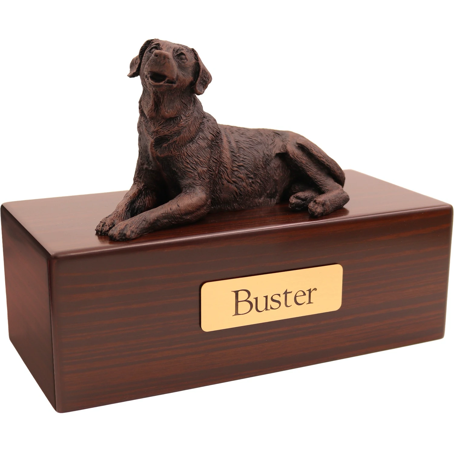 These wonderful “cold cast bronze” figurine urns are designed to look and feel like real bronze. Each figurine is hand painted in Italy and designed to appeal to pet owners whose pet didn’t have the exact coat or color patterns shown in our standard line of “color” figurines. Of course, some people simply prefer the classic appearance of these faux bronze figurines. Each urn base is made from medium density fiberboard (mdf) with a simulated dark walnut stain finish applied. This is a lower cost alternative to our solid hardwood urns, with an additional benefit being that the finish tends to be very consistent from one production series to the next. This means that an urn you purchase in the future will be a close match in color and grain to the ones available now. We’ve also added a genuine oak wood option.