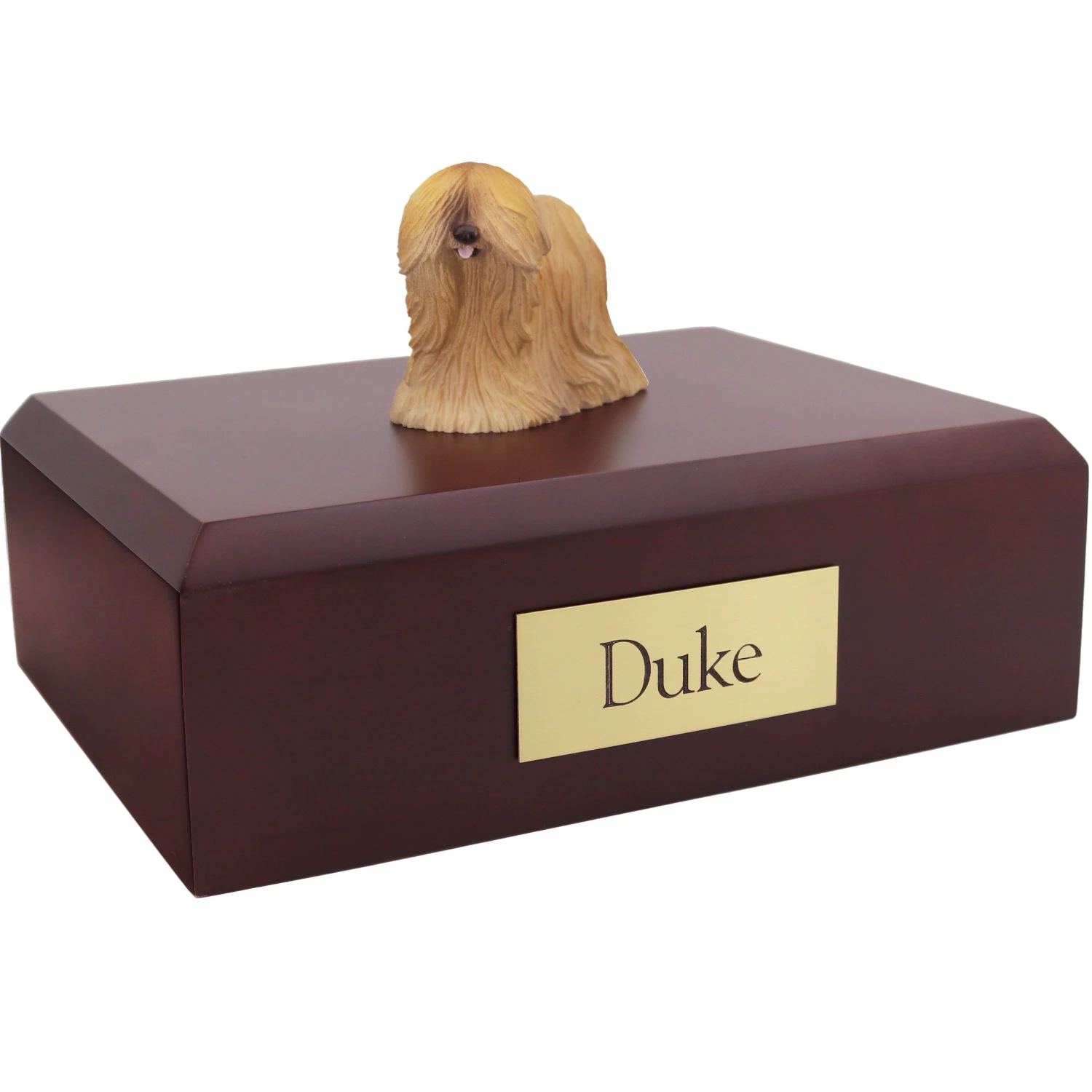 Our most popular urn is our Figurine Urn, made from solid hardwood. (Available in maple, oak, or walnut stain). This urn offers you a choice of over 700 different purebred dog and cat figurines attached to our beautiful wood urn bases. For an additional fee, this Lhasa Apso cremation urn also includes your personal (4 line 100 character) inscription on a premium leaded brass nameplate. Pet’s bagged ashes are installed through removable bottom which is secured with screws, providing tamper resistant protection.