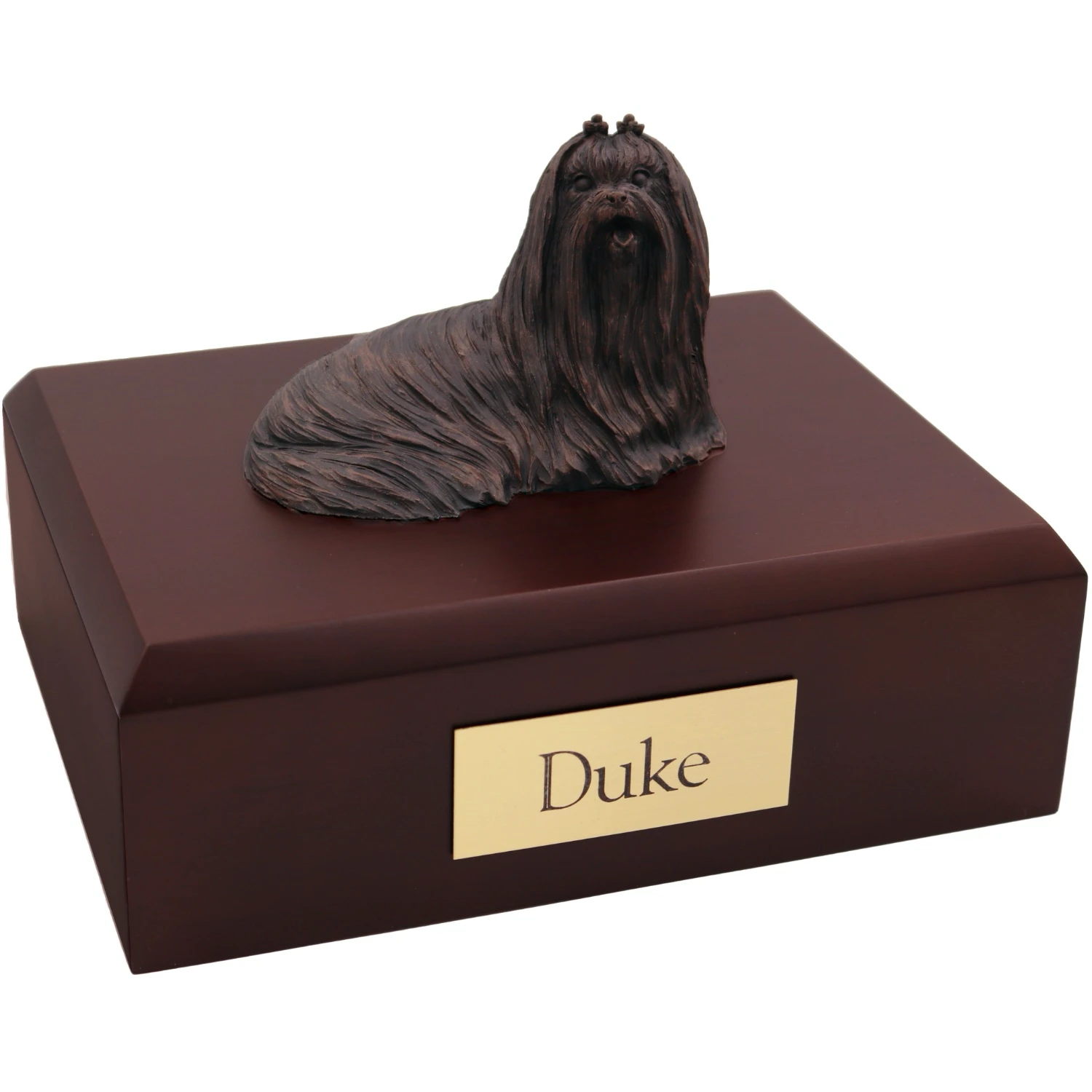 Our “bronze-look” urns are a very popular alternative for customers who either can’t quite find a perfect match for their pet or who are more interested in the classic bronze look. These faux bronze figurines look and feel similar to bronze but are made from a special resin for durability and lasting beauty. The pet figurines have been painted by hand by Italian craftsmen and are mounted on your choice of our solid, sustainable hardwood bases, which are available in a light maple, medium oak or dark walnut finish.