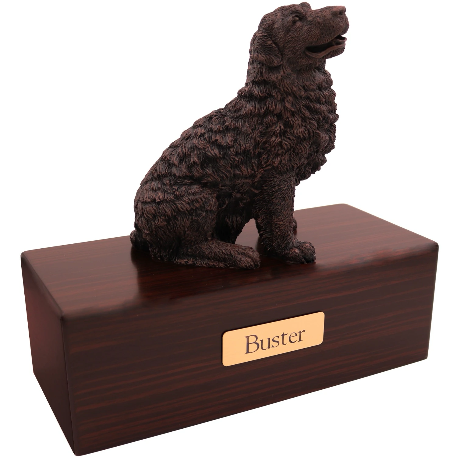 These wonderful “cold cast bronze” figurine urns are designed to look and feel like real bronze. Each figurine is hand painted in Italy and designed to appeal to pet owners whose pet didn’t have the exact coat or color patterns shown in our standard line of “color” figurines. Of course, some people simply prefer the classic appearance of these faux bronze figurines. Each urn base is made from medium density fiberboard (mdf) with a simulated dark walnut stain finish applied. This is a lower cost alternative to our solid hardwood urns, with an additional benefit being that the finish tends to be very consistent from one production series to the next. This means that an urn you purchase in the future will be a close match in color and grain to the ones available now. We’ve also added a genuine oak wood option.