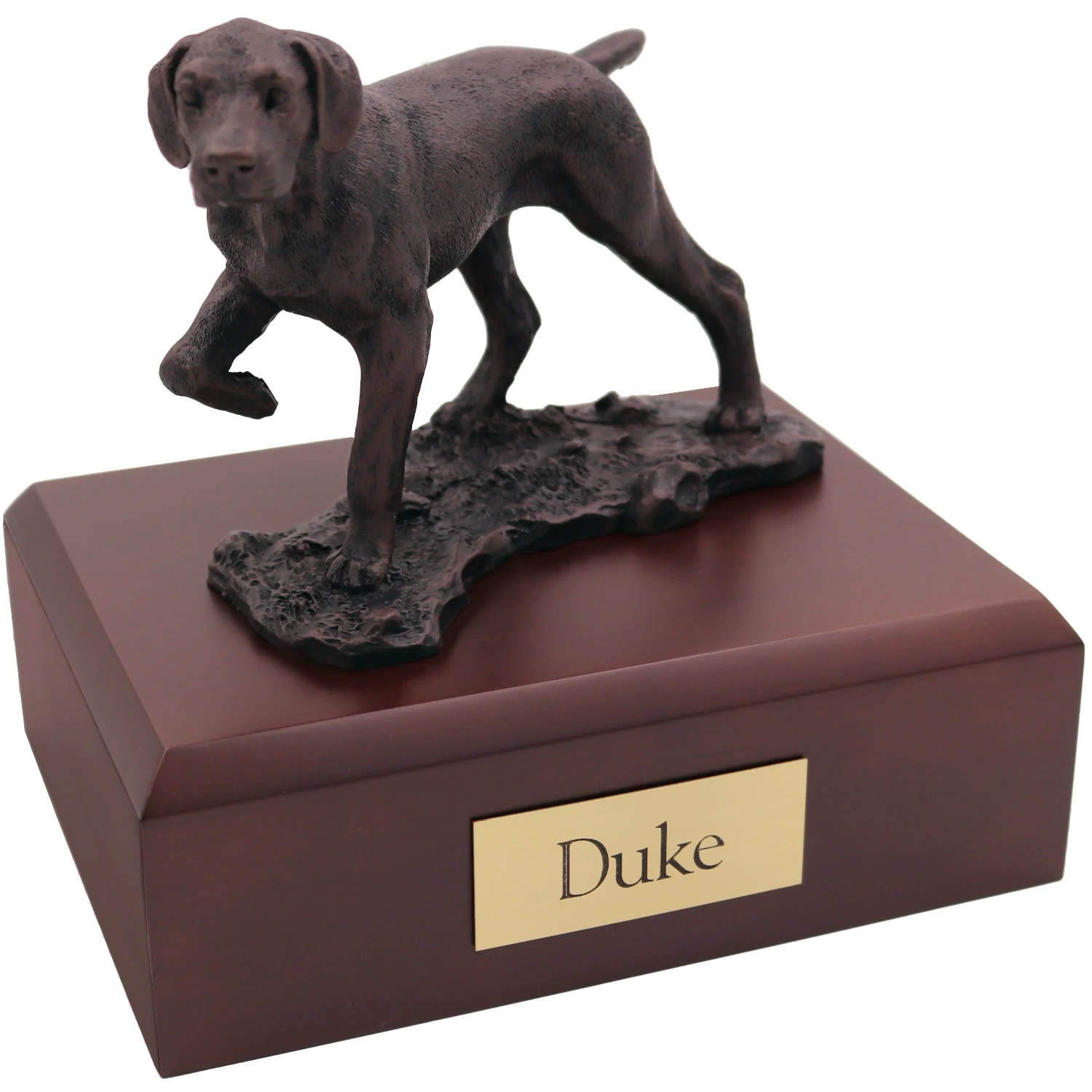 For an additional fee, this Pointer cremation urn also includes your personal (4 line 100 character) inscription on a premium leaded brass nameplate. Pet’s bagged ashes are installed through removable bottom which is secured with screws, providing tamper resistant protection.