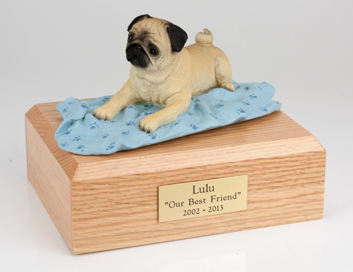 Our most popular urn is our Figurine Urn, made from solid hardwood. (Available in maple, oak, or walnut stain). This urn offers you a choice of over 700 different purebred dog and cat figurines attached to our beautiful wood urn bases. For an additional fee, this Pug cremation urn also includes your personal (4 line 100 character) inscription on a premium leaded brass nameplate. Pet’s bagged ashes are installed through removable bottom which is secured with screws, providing tamper resistant protection.