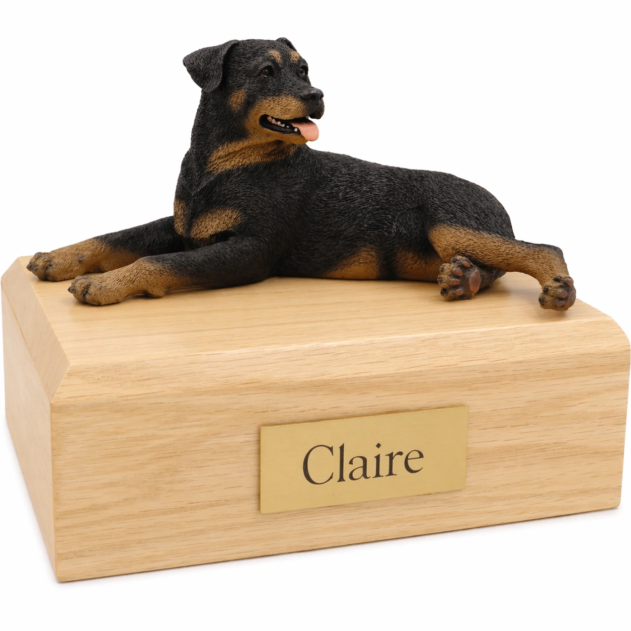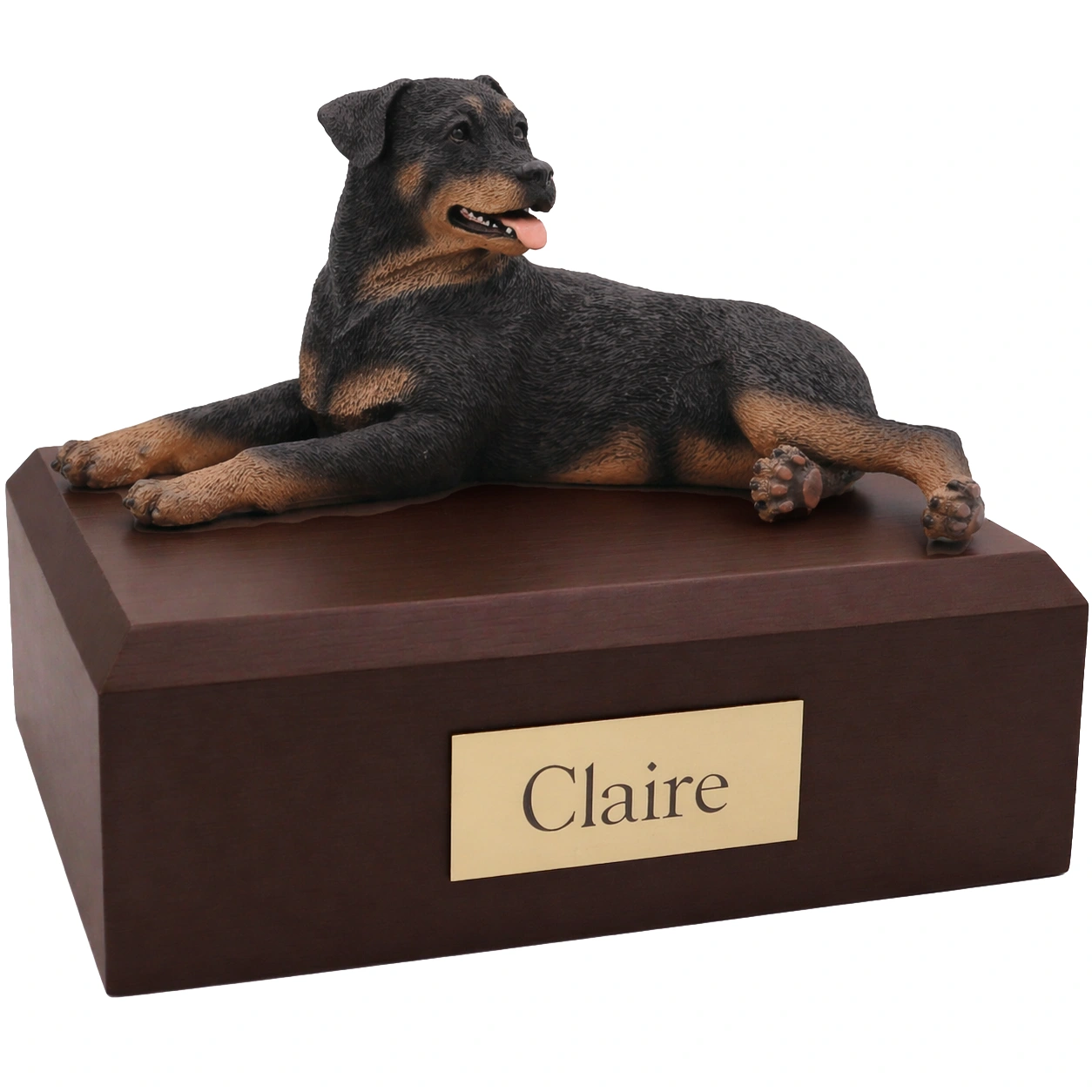 Our most popular urn is our Figurine Urn, made from solid hardwood. (Available in maple, oak, or walnut stain). This urn offers you a choice of over 700 different purebred dog and cat figurines attached to our beautiful wood urn bases. For an additional fee, this Rottweiler cremation urn also includes your personal (4 line 100 character) inscription on a premium leaded brass nameplate. Pet’s bagged ashes are installed through removable bottom which is secured with screws, providing tamper resistant protection. See chart below for enclosure capacity.