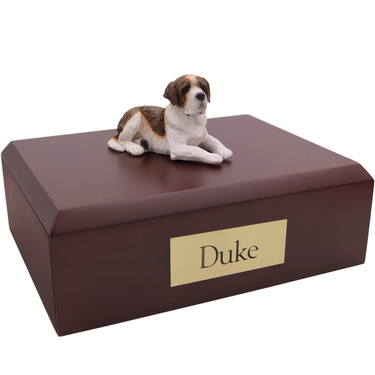 Our most popular urn is our Figurine Urn, made from solid hardwood. (Available in maple, oak, or walnut stain). This urn offers you a choice of over 700 different purebred dog and cat figurines attached to our beautiful wood urn bases. For an additional fee, this Saint Bernard cremation urn also includes your personal (4 line 100 character) inscription on a premium leaded brass nameplate. Pet’s bagged ashes are installed through removable bottom which is secured with screws, providing tamper resistant protection. See chart below for enclosure capacity.