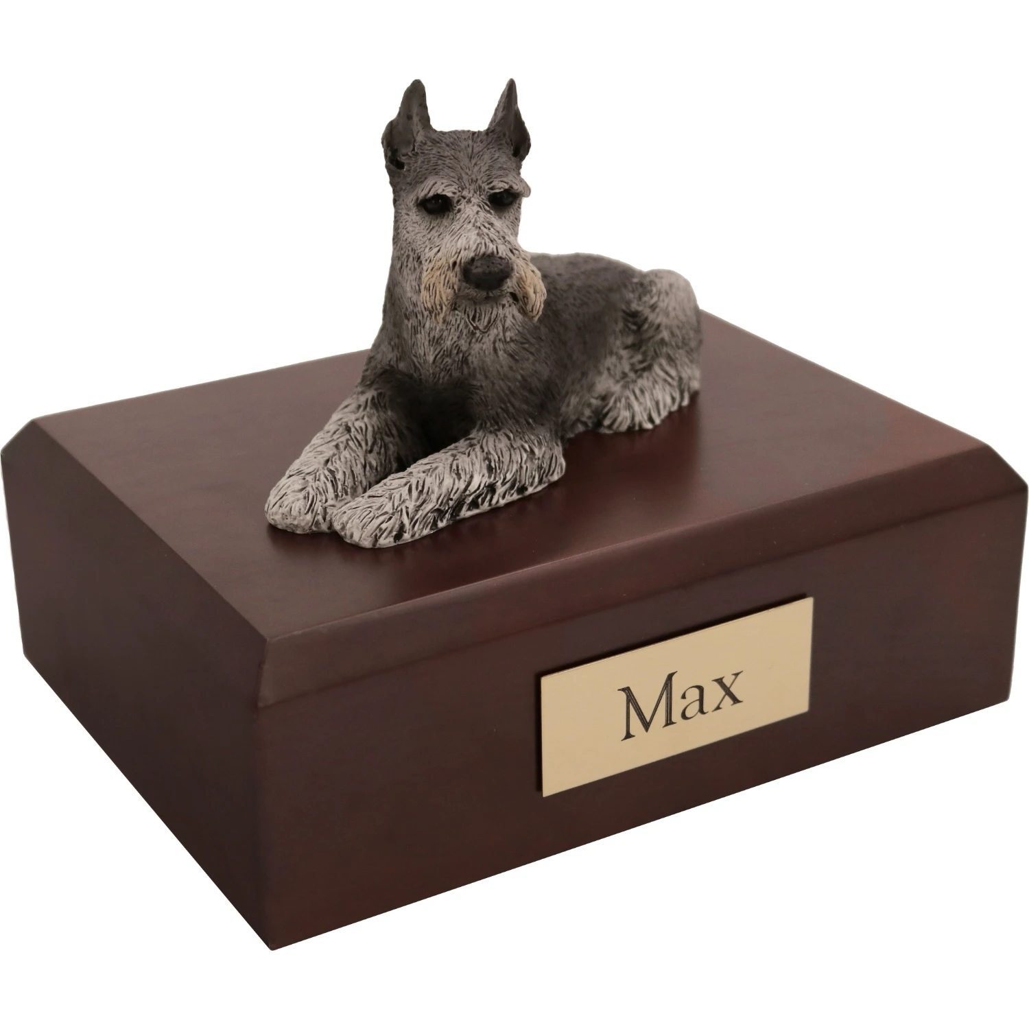 Our most popular urn is our Figurine Urn, made from solid hardwood. (Available in maple, oak, or walnut stain). This urn offers you a choice of over 700 different purebred dog and cat figurines attached to our beautiful wood urn bases. For an additional fee, this Black & Silver Schnauzer cremation urn also includes your personal (4 line 100 character) inscription on a premium leaded brass nameplate. Pet’s bagged ashes are installed through removable bottom which is secured with screws, providing tamper resistant protection. See chart below for enclosure capacity.