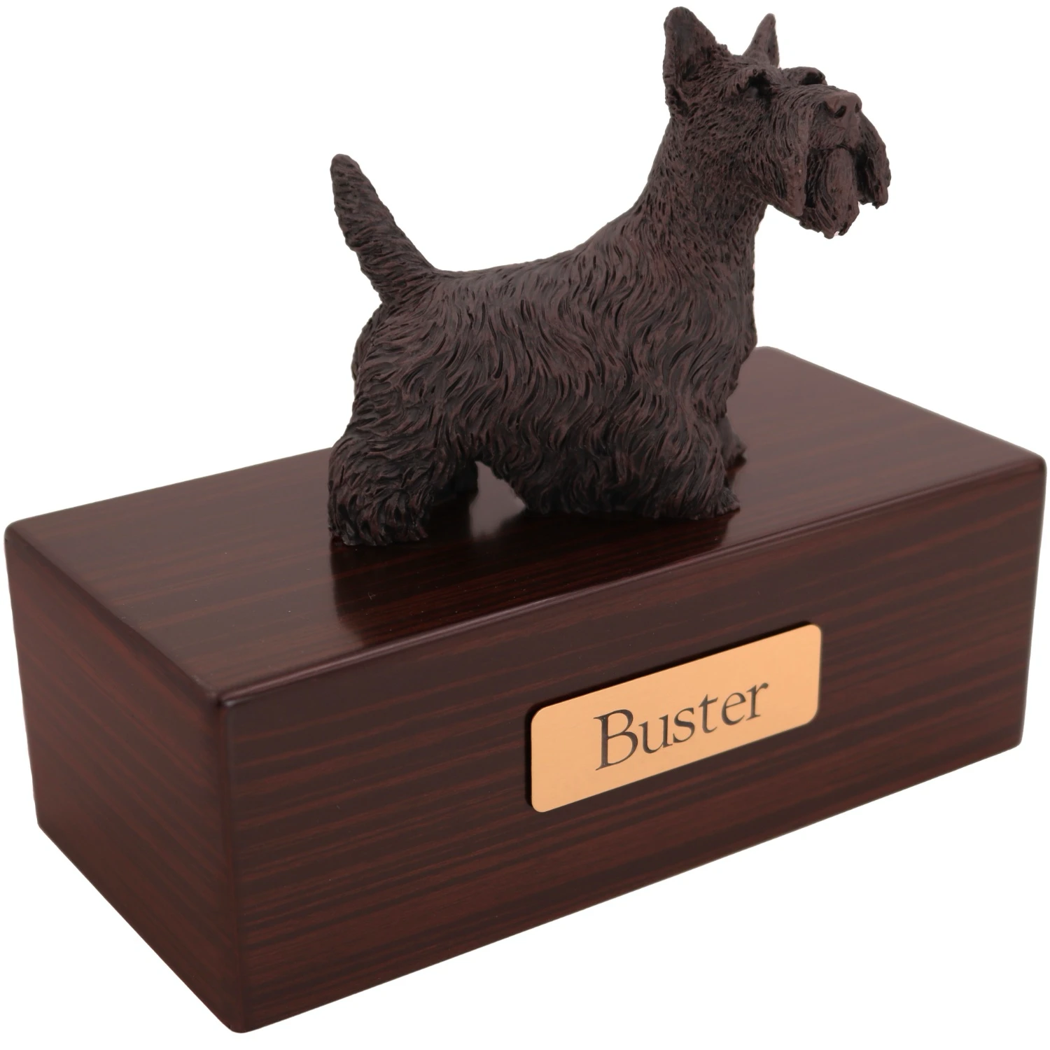 These wonderful “cold cast bronze” figurine urns are designed to look and feel like real bronze. Each figurine is hand painted in Italy and designed to appeal to pet owners whose pet didn’t have the exact coat or color patterns shown in our standard line of “color” figurines. Of course, some people simply prefer the classic appearance of these faux bronze figurines. Each urn base is made from medium density fiberboard (mdf) with a simulated dark walnut stain finish applied. This is a lower cost alternative to our solid hardwood urns, with an additional benefit being that the finish tends to be very consistent from one production series to the next. This means that an urn you purchase in the future will be a close match in color and grain to the ones available now. We’ve also added a genuine oak wood option.