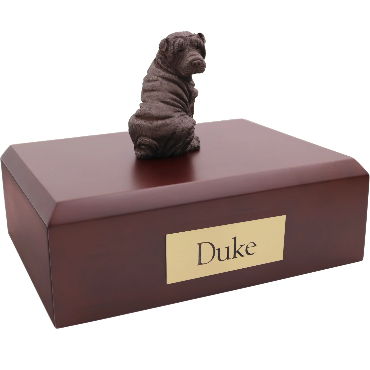 Our most popular urn is our Figurine Urn, made from solid hardwood. (Available in maple, oak, or walnut stain). This urn offers you a choice of over 700 different purebred dog and cat figurines attached to our beautiful wood urn bases. For an additional fee, this Shar Pei cremation urn also includes your personal (4 line 100 character) inscription on a premium leaded brass nameplate. Pet’s bagged ashes are installed through removable bottom which is secured with screws, providing tamper resistant protection. See chart below for enclosure capacity.