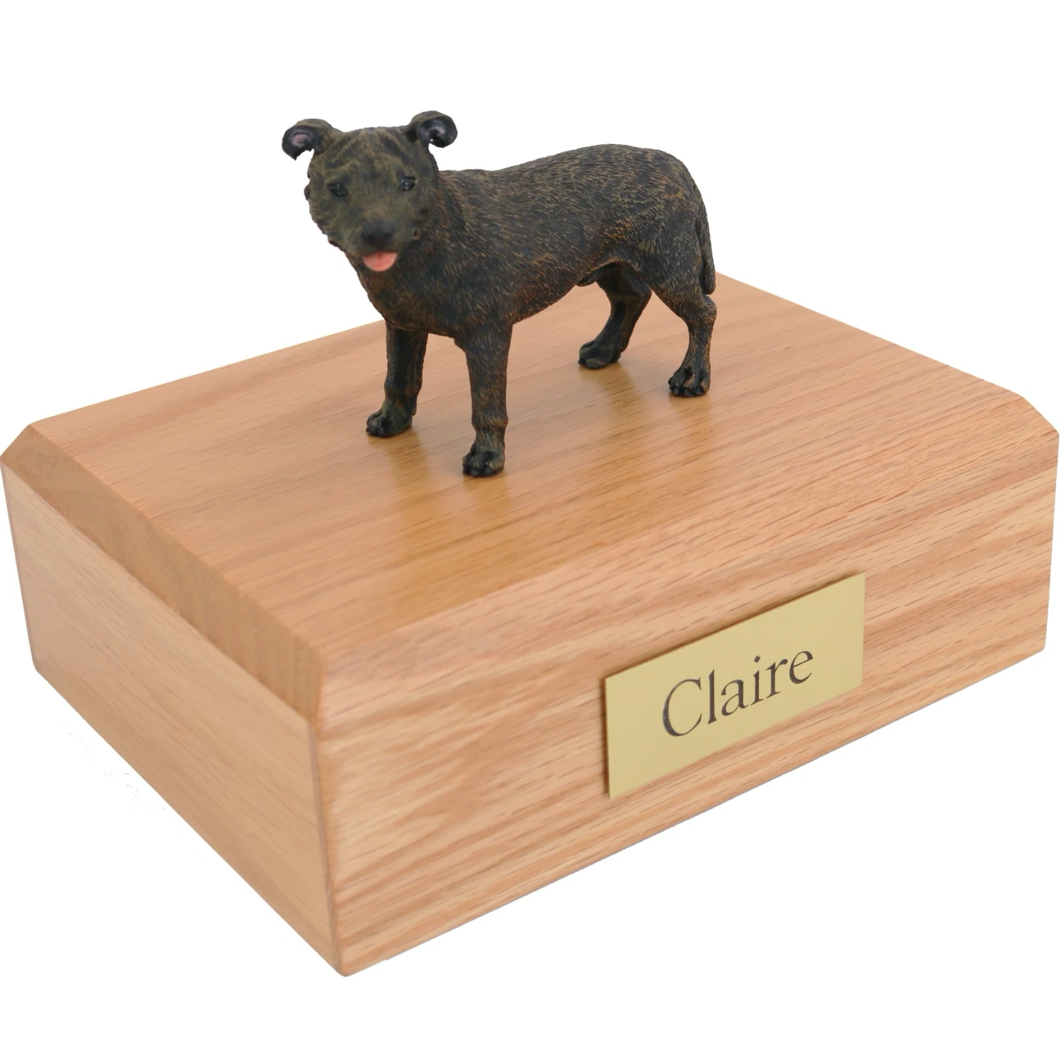 Our most popular urn is our Figurine Urn, made from solid hardwood. (Available in maple, oak, or walnut stain). This urn offers you a choice of over 700 different purebred dog and cat figurines attached to our beautiful wood urn bases. For an additional fee, this Staffordshire Bull Terrier cremation urn also includes your personal (4 line 100 character) inscription on a premium leaded brass nameplate. Pet’s bagged ashes are installed through removable bottom which is secured with screws, providing tamper resistant protection. See chart below for enclosure capacity.