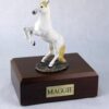 These Figurine Urns are the most requested urns we offer. They feature a meticulously crafted pet figurine atop an urn which has been made from solid hardwood. (Available in maple, oak, or walnut stain). This urn offers you a choice of over 700 different purebred dog and cat figurines attached to our beautiful wood urn bases. For an additional fee, this White Rearing Horse cremation urn also includes your personal (4 line 100 character) inscription on a premium leaded brass nameplate. Pet’s bagged ashes are installed through removable bottom which is secured with screws, providing tamper resistant protection.