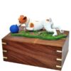 Our figurine series urns feature solid Indian Rosewood, with optional engraving available. This Jack Russell Terrier, Black and White, With Ball On Grass dog urn and the rest of our line of figurine cremation urns are our most popular pet urns. Stunning detail, fine hardwood and fast delivery at the lowest prices; it’s a wonderful keepsake with which to preserve the memory of your beloved departed family member.