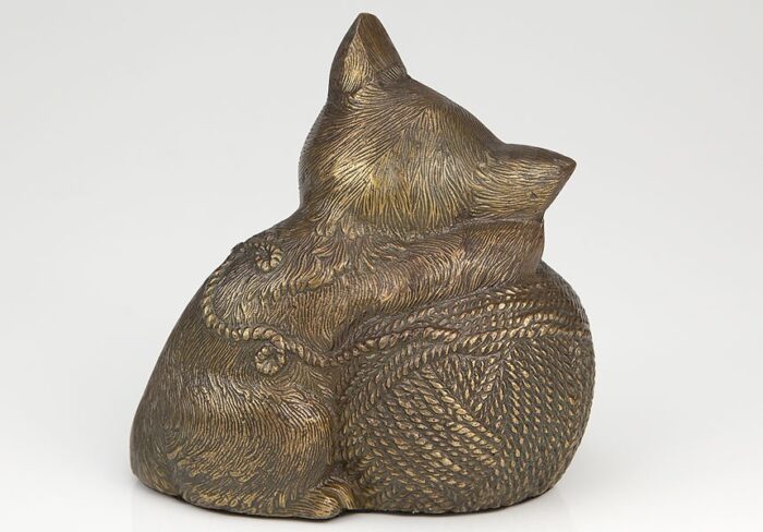 Bring your beloved companion home one final time in a beautifully made cremation urn designed specifically for felines. This artistic quality urn will honor the memory of your precious cat and is available in the four popular finishes of bronze, silver, gold and copper antique. Made from cast resin, these urns go through several steps of labor intensive finishing to create a truly wonderful cremation memorial. Your pet’s ashes are installed through a bottom opening secured tightly with a round tamper resistant plastic closure.