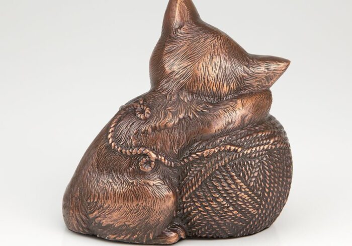 Bring your beloved companion home one final time in a beautifully made cremation urn designed specifically for felines. This artistic quality urn will honor the memory of your precious cat and is available in the four popular finishes of bronze, silver, gold and copper antique. Made from cast resin, these urns go through several steps of labor intensive finishing to create a truly wonderful cremation memorial. Your pet’s ashes are installed through a bottom opening secured tightly with a round tamper resistant plastic closure.