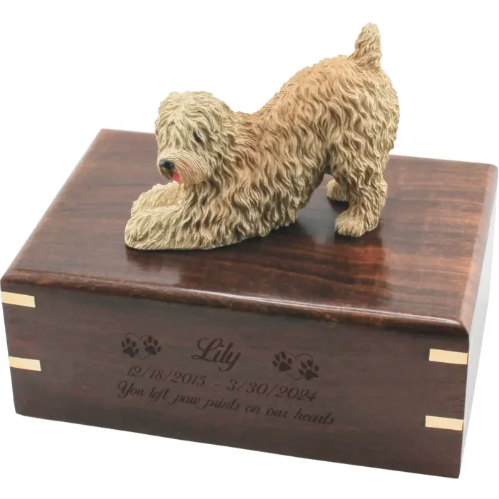 Our figurine series urns feature solid Indian Rosewood, with optional engraving available. This Soft Coated Wheaten urn and the rest of our line of figurine cremation urns are our most popular pet urns. Stunning detail, fine hardwood and fast delivery at the lowest prices; it’s a wonderful keepsake with which to preserve the memory of your beloved departed family member.